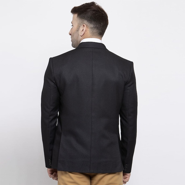 Black solid tailored-fit blazer, has a notched lapel collar, single-breasted with button closure, long sleeves, three welt pockets, double vented back hem and an attached lining.