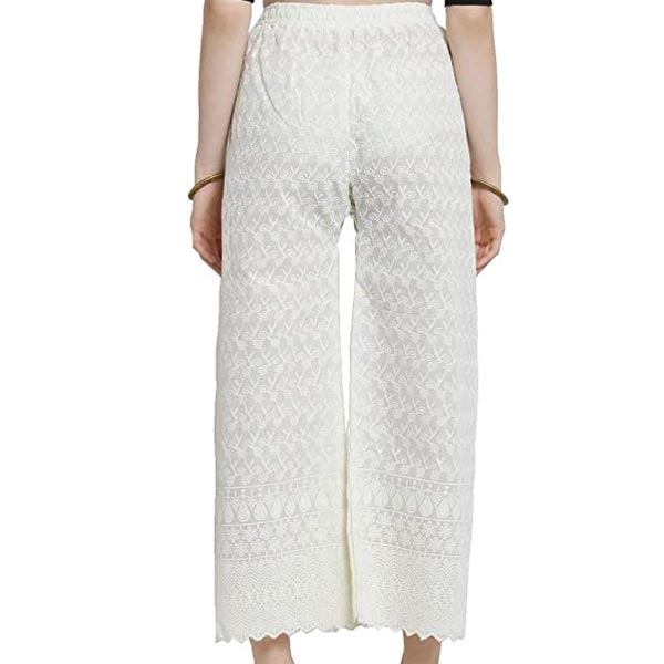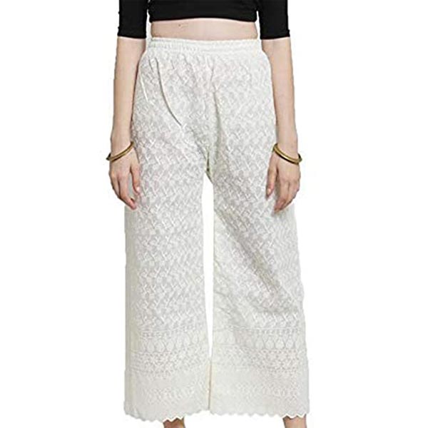 • Casual Cotton Chikan Palazzo With Broad elasticated waistband . Stretchable from 28 inches to 44 inches.