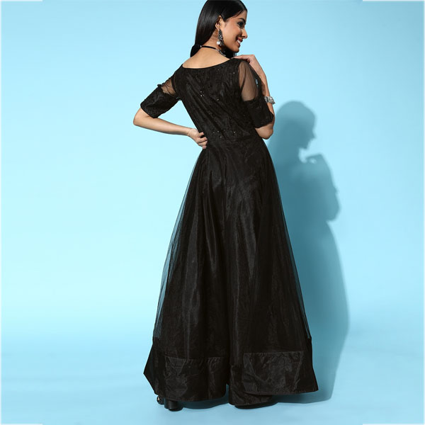 Look stunning when you wear this modish dress. It features a charming ethnic motifs and V-neck to amplify your overall appeal.
